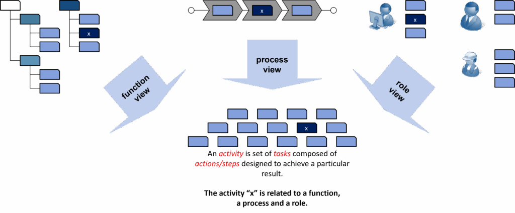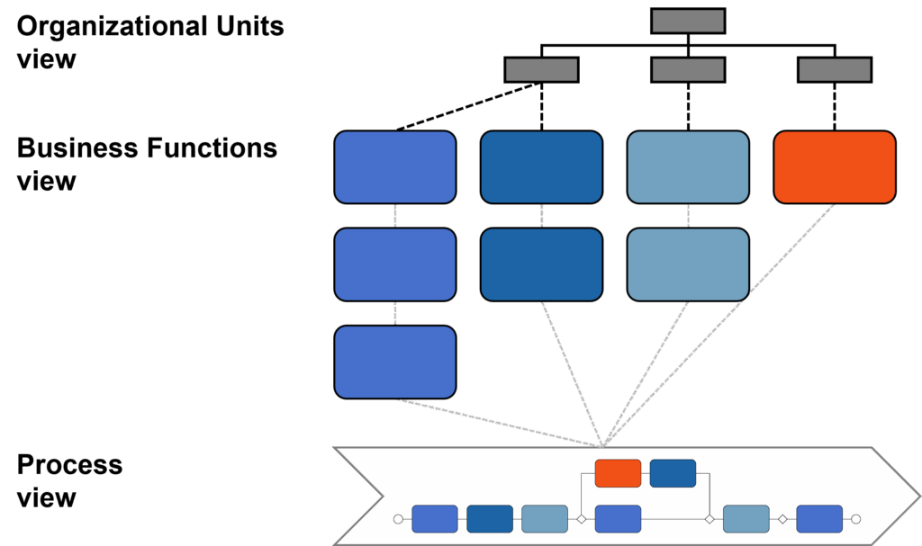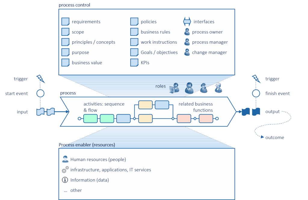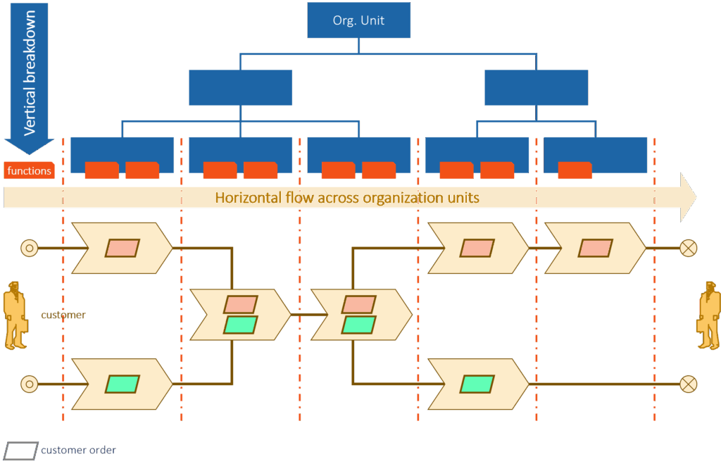 Processes describe a “horizontal” view. A business process is seen as a series of interrelated steps or activities carried out to achieve a specific outcome or objective within or across functions / organization units.