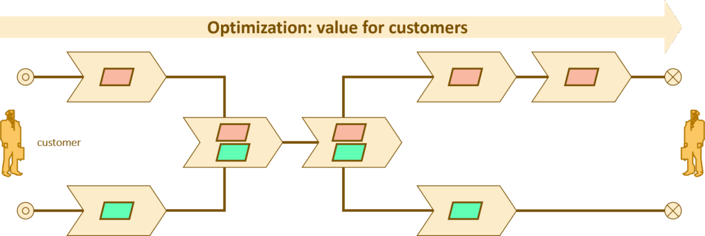 Business process management changes the perspective from the organization unit to the customer. The question is no longer “how can I optimize my organization?”. From a customer point of view we have to ask the question “How can we get a competitive advantage?”. To answer this question we have a look at the business processes which are crossing organization units.