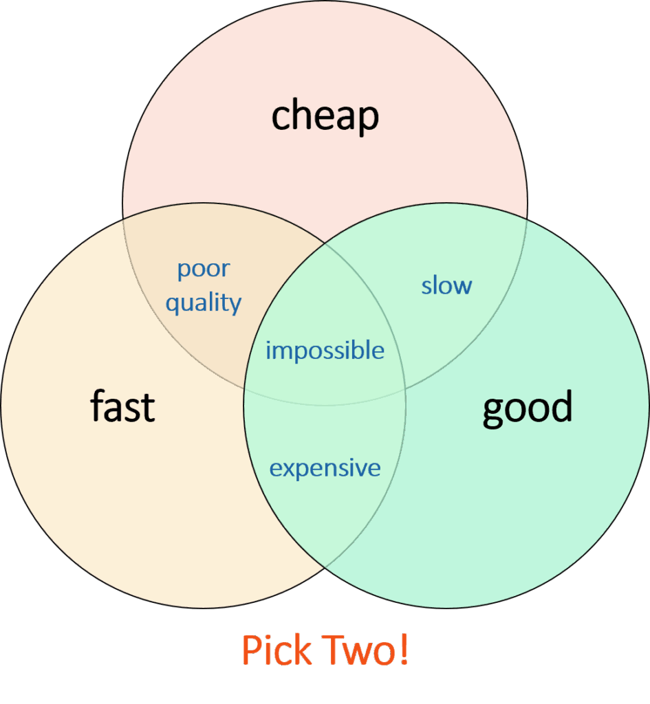 The saying “Good, Fast, Cheap: Pick Two“ refers to the competitive factors price, quality, and time. It means you can’t have all three choices at once.