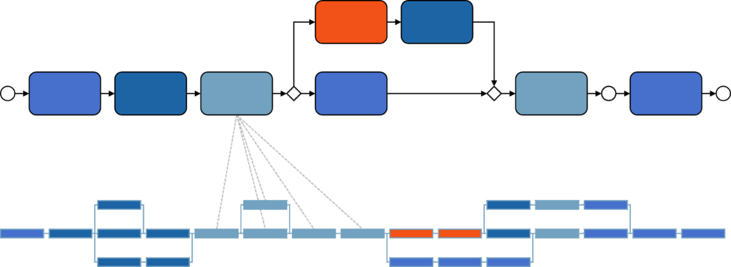 The workflow or sequence flow represents the sequence in which different events, activities, and further elements are traversed.