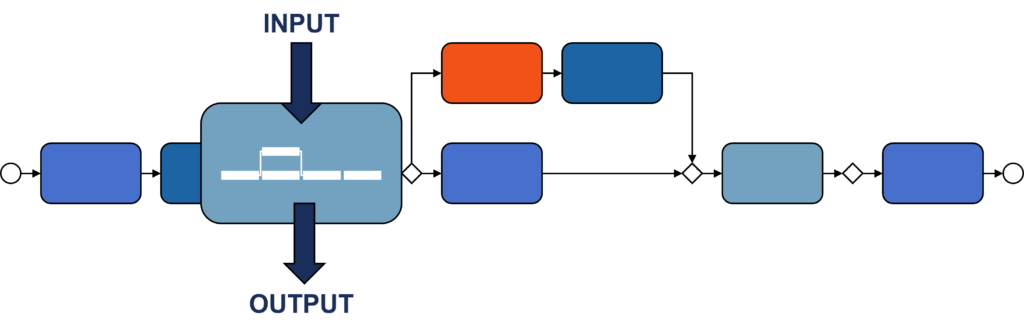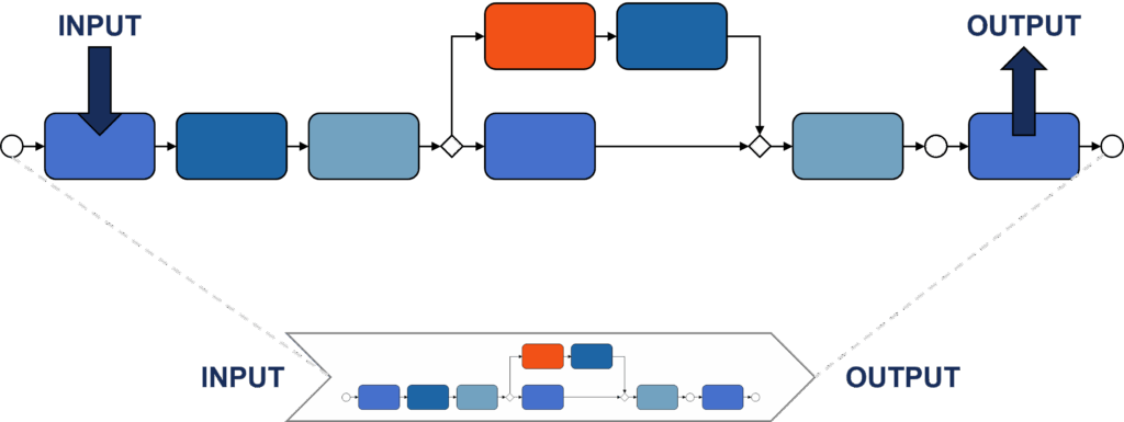 The business process interface specification defines the relationships to other business processes. Output of one process could be input of another process.