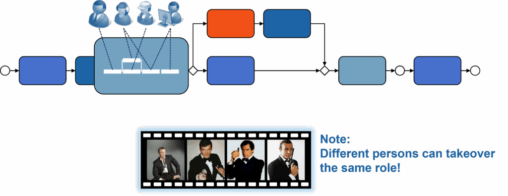 Responsibilities, skills and competences are described by roles. Roles establish a link between persons and activities.
