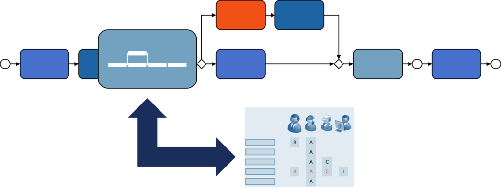 A RACI matrix (also called a Responsibility Assignment Matrix) is a simple method to clarify roles and responsibilities for tasks applied in a business process.