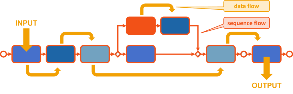 When a process is carried out, it uses/creates input/output like data, information, files, documents, etc. A sequence flow from one activity to another is often accompanied by data flow.
