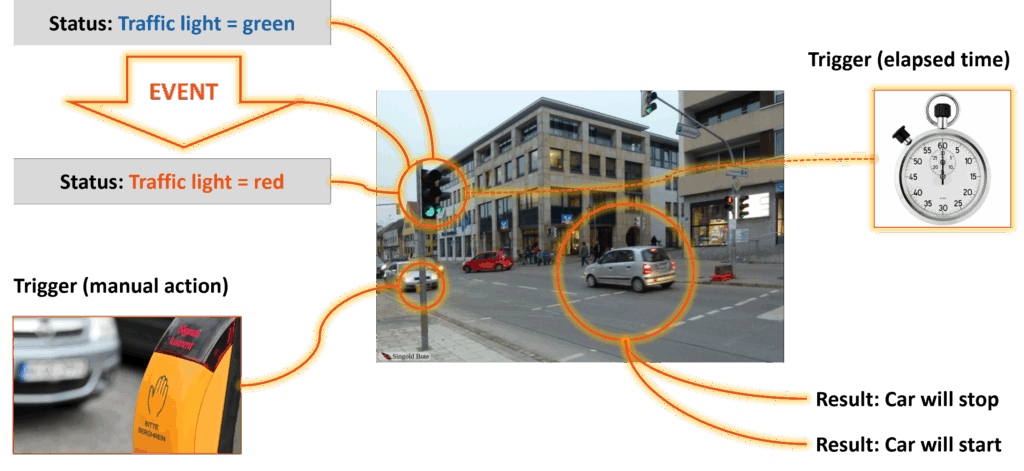 In our traffic light example the event “traffic light changed” can be triggered by pushing a button or, time driven by a clock, when a certain amount of time is elapsed.