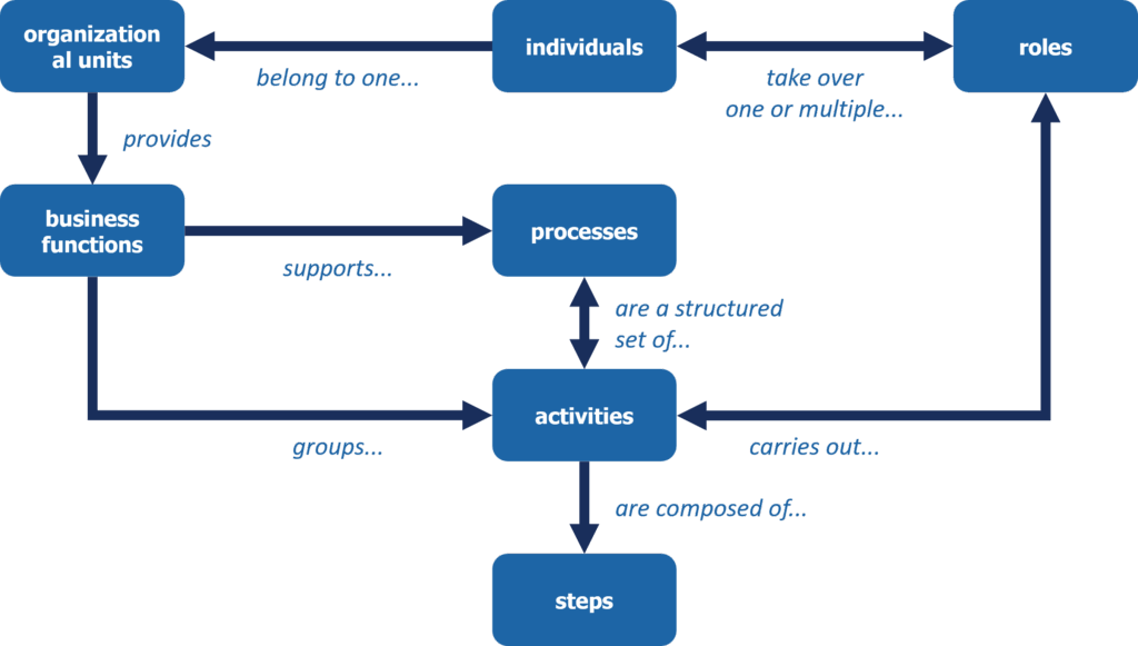 The entity relationship diagram below shows, how the different elements of a business process descriptions belong together.