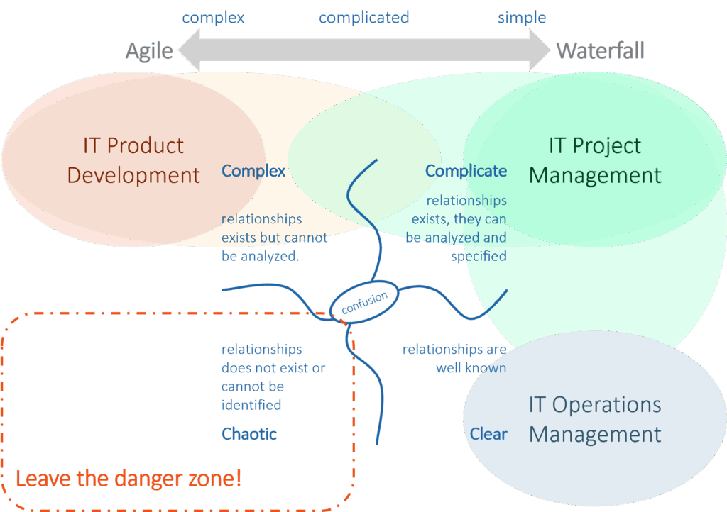 This domain we find typically IT projects that are handled according to the waterfall approach: Analyzing requirements, developing and implementing solutions.